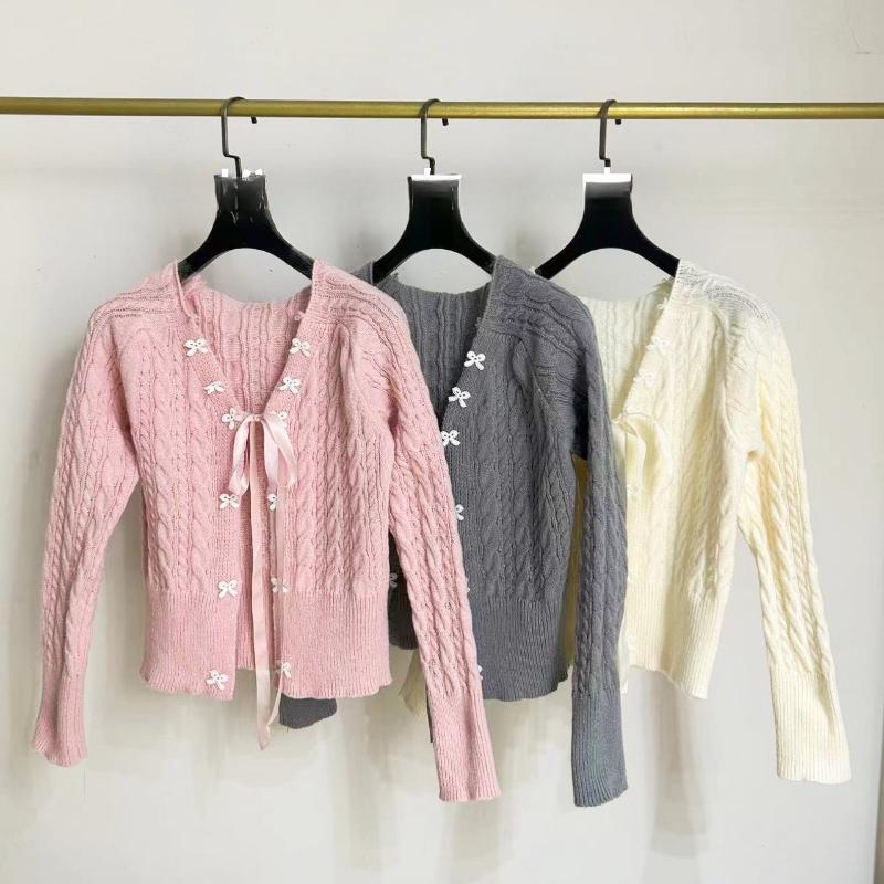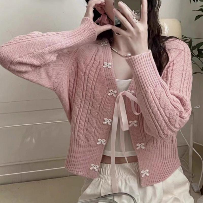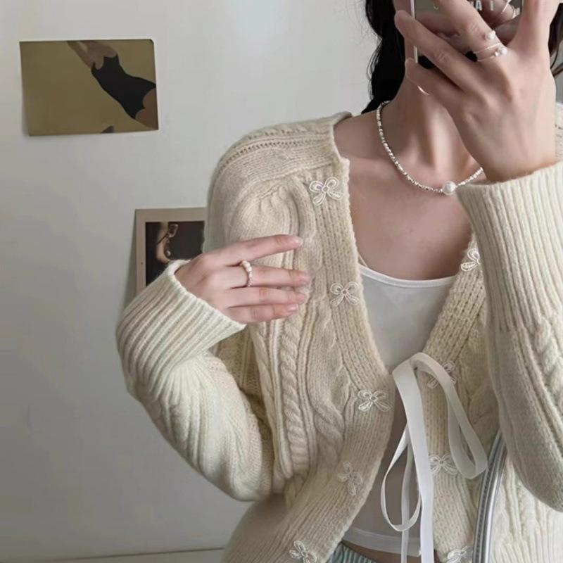 Корейский Кардиган Вязаный с Бантом в Свежем Стиле Женский Осенний Свитер-Пальто Топ в Ретро Дизайне