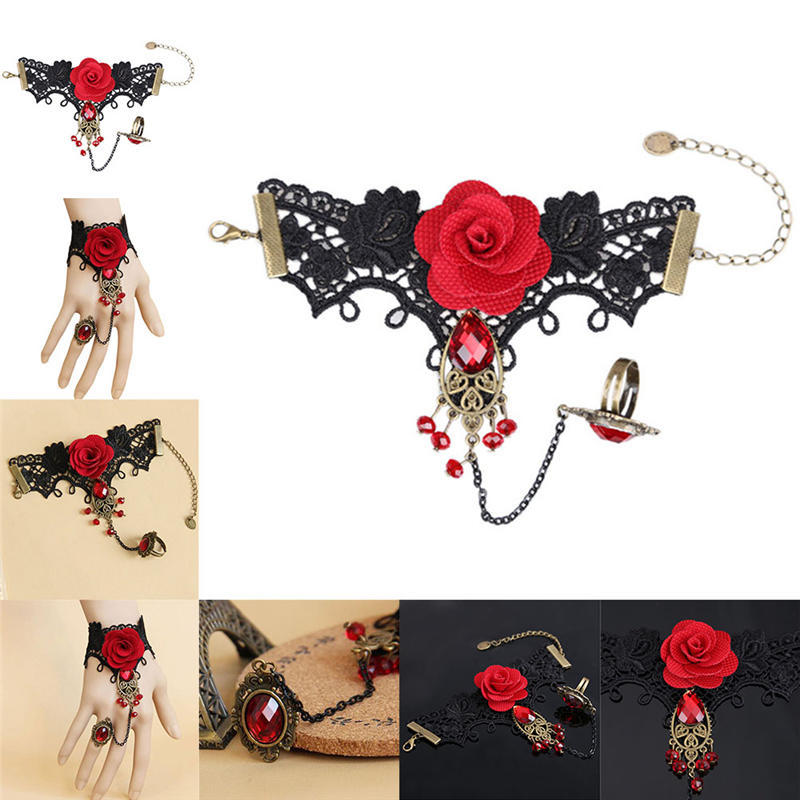 Горячий новый элегантный готический стиль кружева красная роза браслет с регулируемым кольцом для пальца