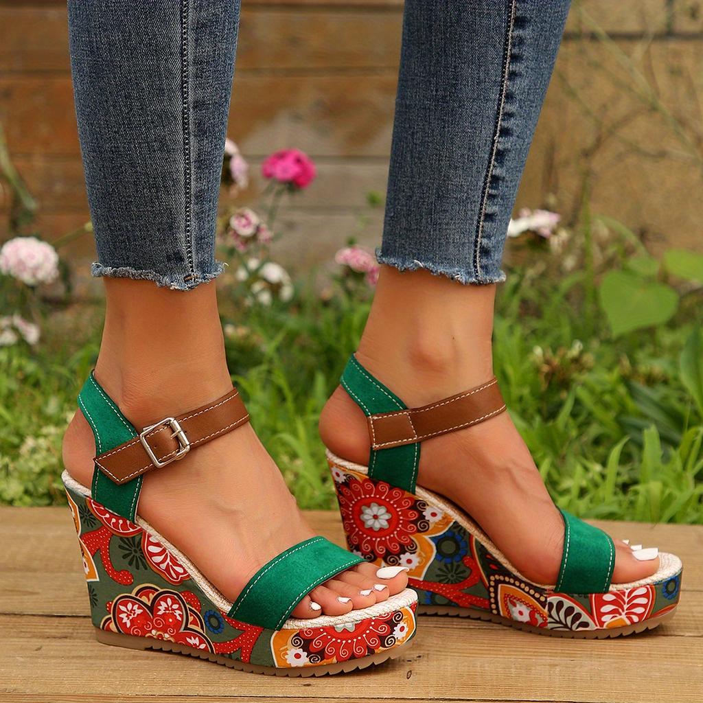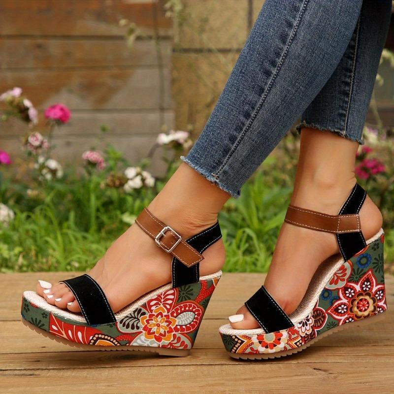 Летние босоножки на танкетке с цветочным принтом для женщин из искусственной кожи с пряжкой на платформе и высоким каблуком