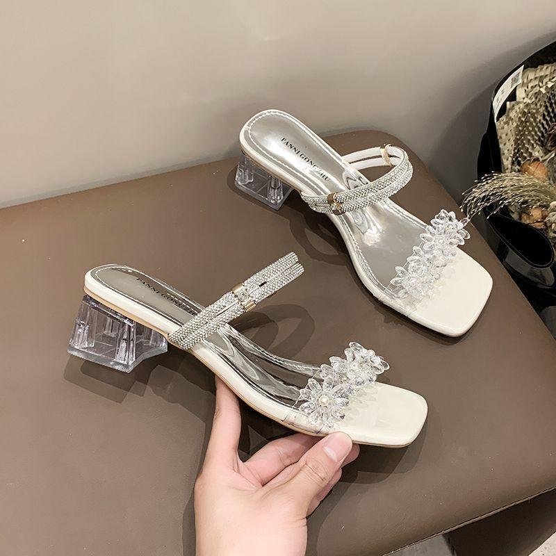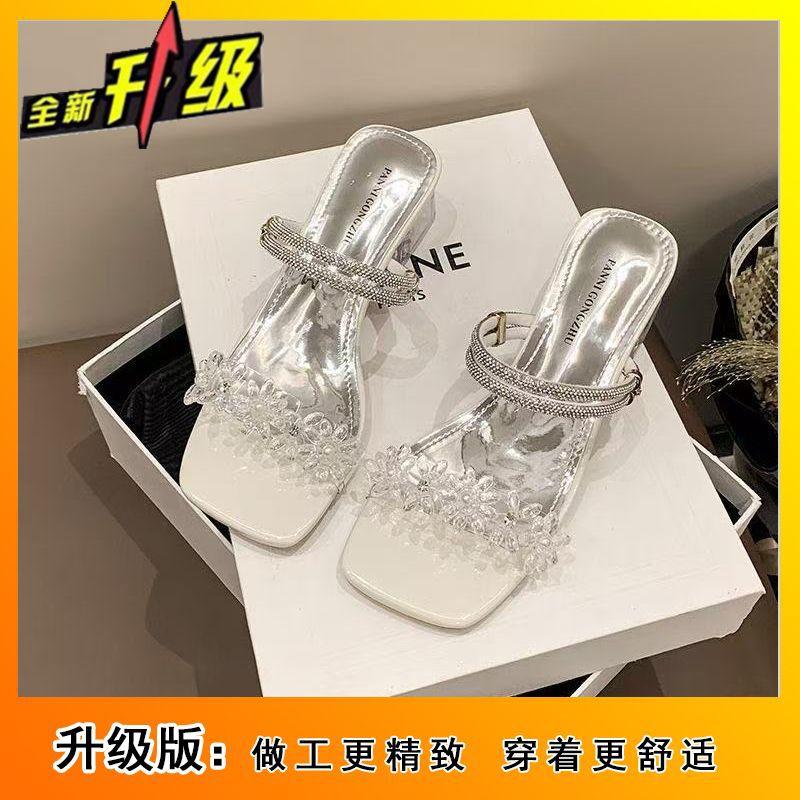 Сандалии 2025 новая летняя мода универсальные стразы слово с юбкой квадратный носок фея кристалл высокие каблуки шлепанцы