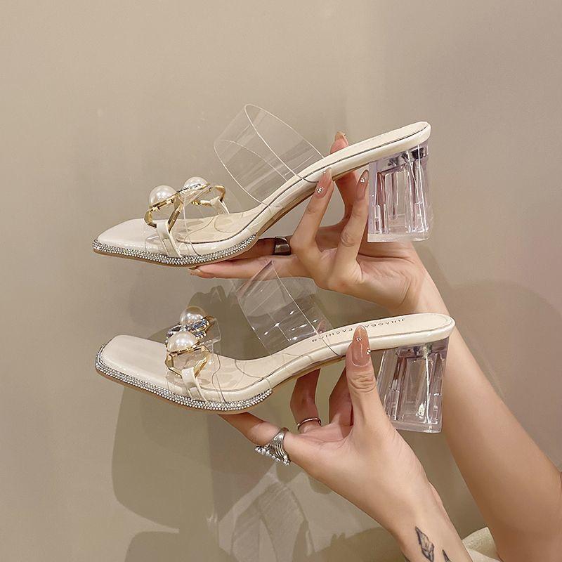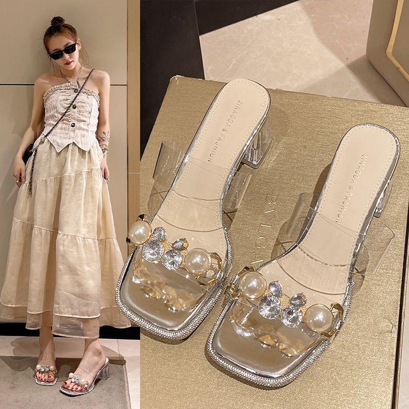 Шлепанцы со стразами-жемчужинами женская обувь для улицы 2025 лето прозрачные высокие каблуки толстый средний каблук сандалии с открытым носком