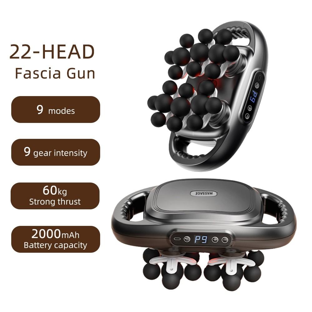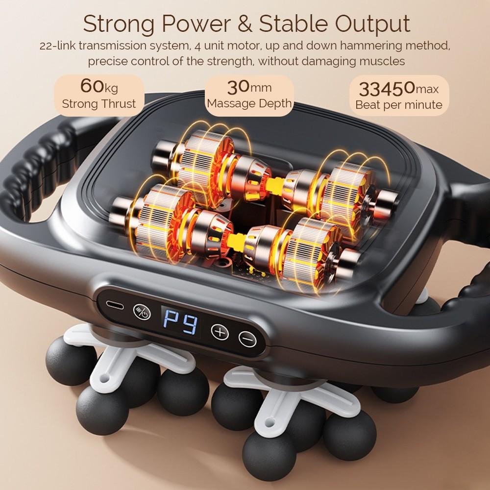 1. 22 ГОЛОВЫ. Уникальная технология соединения 22 осей для более глубокого массажа и большей площади массажа. Перкуссионный массажный пистолет может наносить удары 14400 раз в секунду, глубина амплитуды составляет 30 мм, благодаря высокочастотной вибрации, он может эффективно расслабить мышечную фасцию, сделать мышцы мягкими и эластичными.