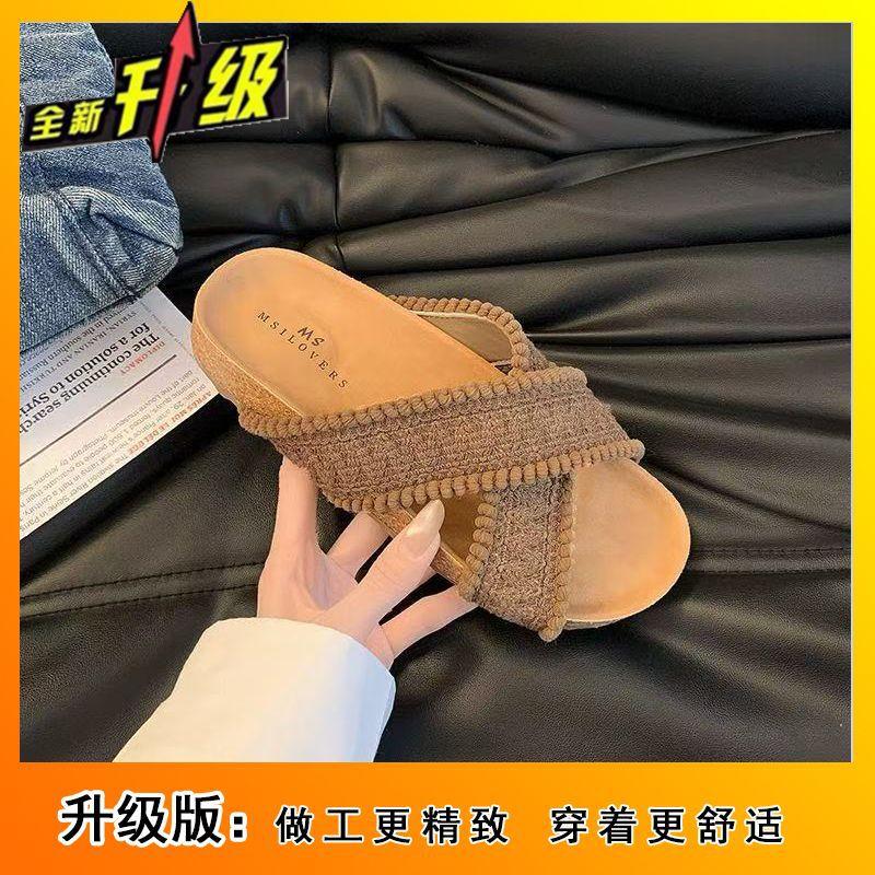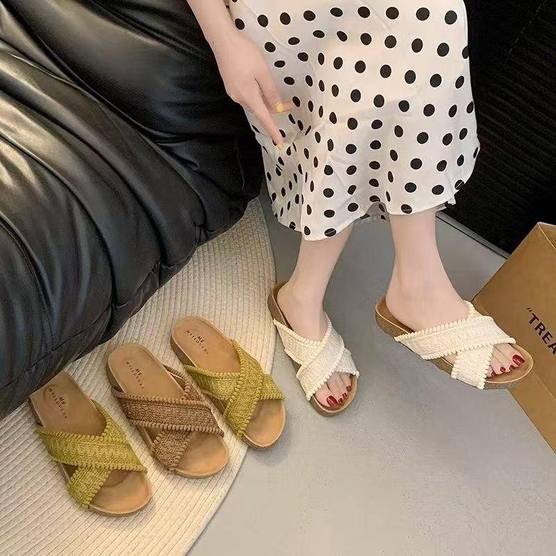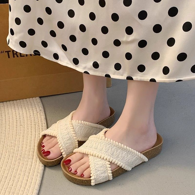 Винтажные пляжные шлепанцы с открытым носком и вязаными тапочками женские 2025 лето новые шлепанцы с перекрещенными ремешками