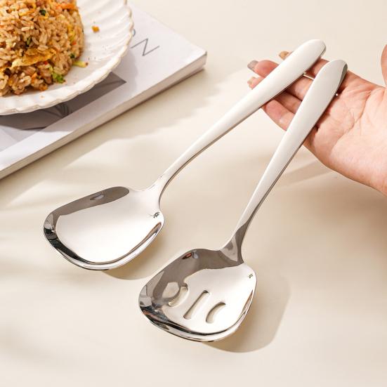 Легко чистящаяся гладкая поверхность: Гладкая поверхность из нержавеющей стали предотвращает прилипание остатков пищи, облегчая легкую очистку и уход.. Поддерживая чистоту без усилий, эта ложка разработана для долгосрочного использования в общественных местах без ущерба для стандартов.