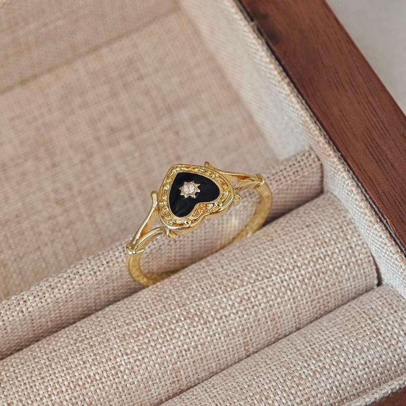 Золотое готическое кольцо с черным эмалевым сердцем - Капающее масло, легкая роскошь, парный стиль