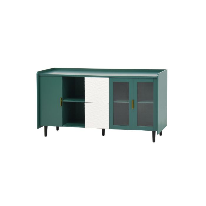 Meuble de rangement de 55 pouces comprenant deux tiroirs, deux compartiments ouverts et deux portes vitrées, vert.
