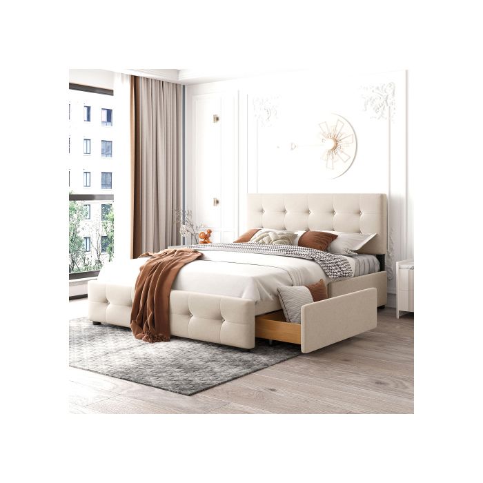 Lit double - MUVOE - 140 x 200 cm - Beige - Rembourré avec tiroirs - Structure en métal