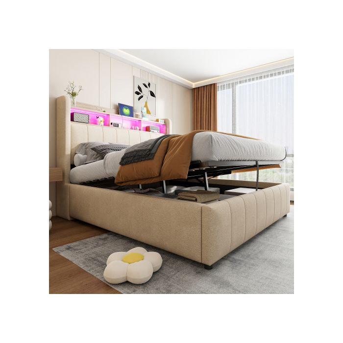 Lit rembourré - MUVOE - 140x200 cm - Éclairage LED - Prise USB - Rangement intégré