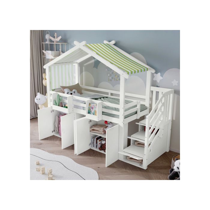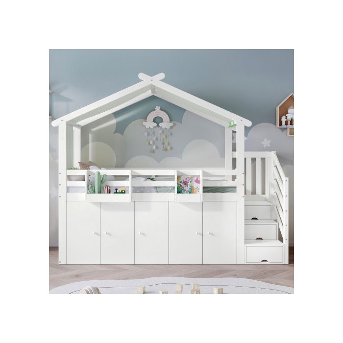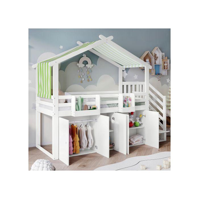 Lits superposés - MUVOE - 2 places - Blanc - Avec barrières de sécurité - Rangement intégré