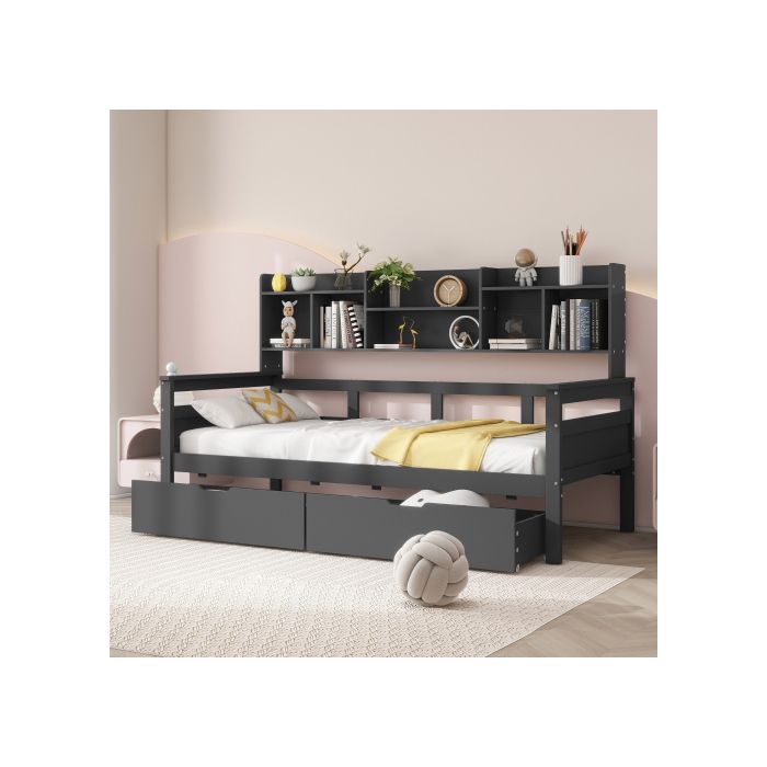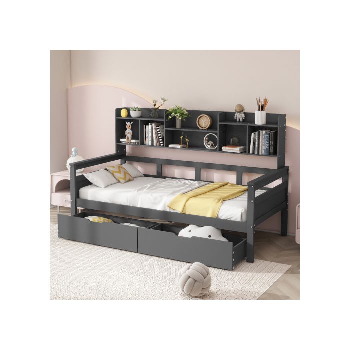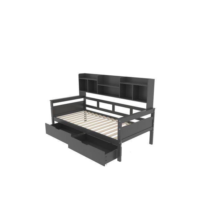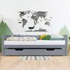 Canapé-lit - MUVOE - 90x200 cm - Bois massif - Tiroirs de rangement - Gris élégant