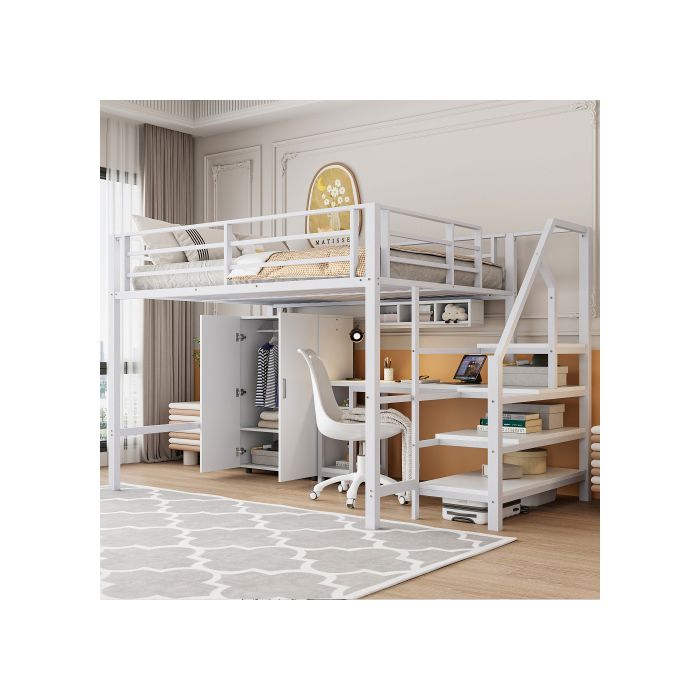 Освещенный мезонин - MUVOE - 140x200см - Белый - Встроенный рабочий стол - Шкаф и полки включены