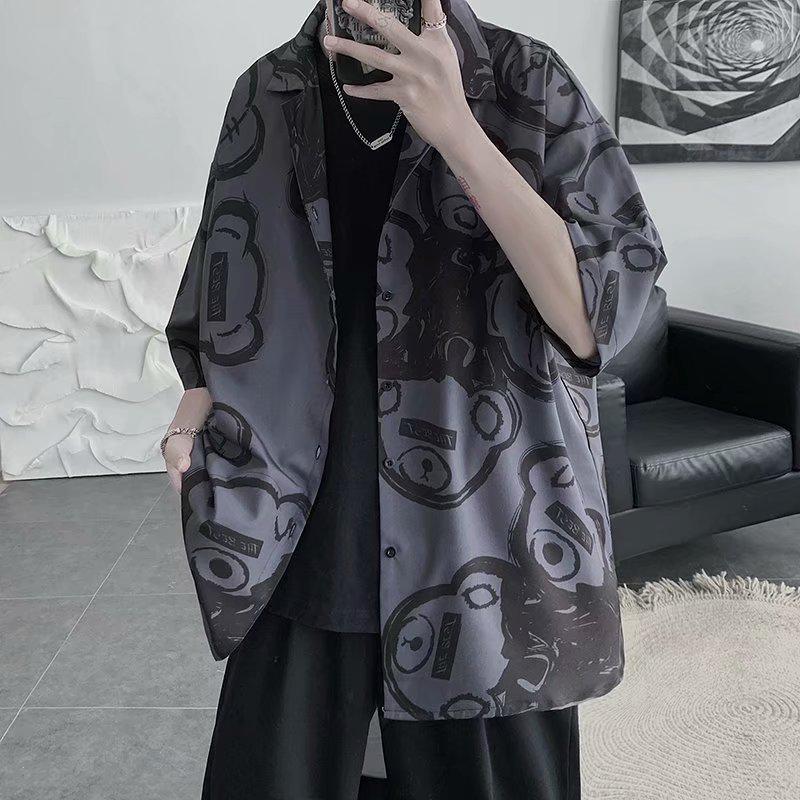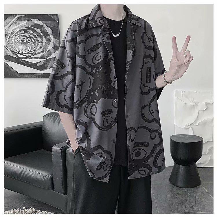 Мужская летняя 2021 года повседневная рубашка свободного кроя с принтом в корейском стиле, с рукавом до локтя