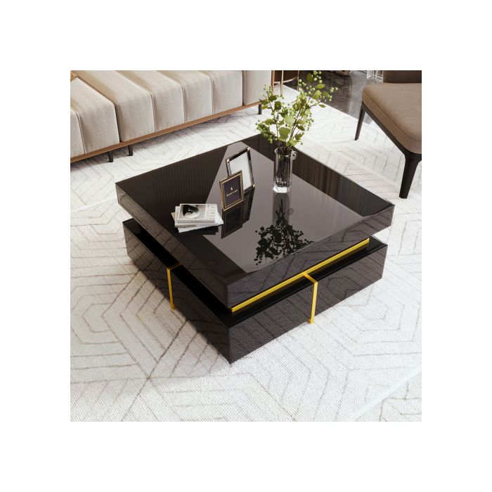 Table basse - MUVOE - Haute brillance - 2 tiroirs - Accents dorés - Design contemporain