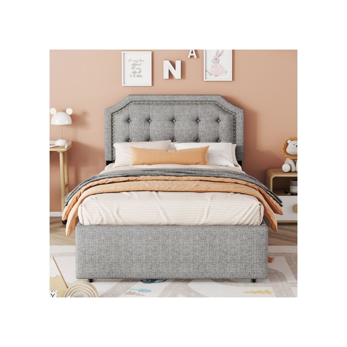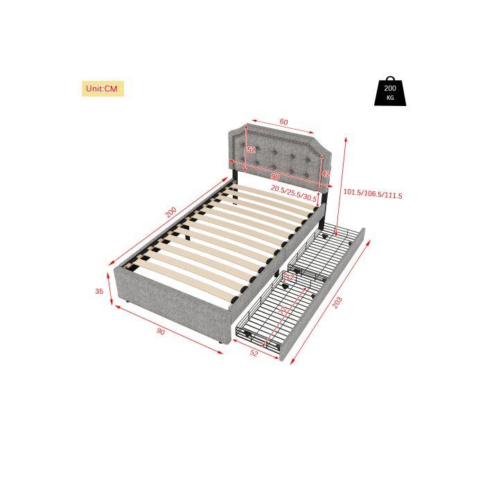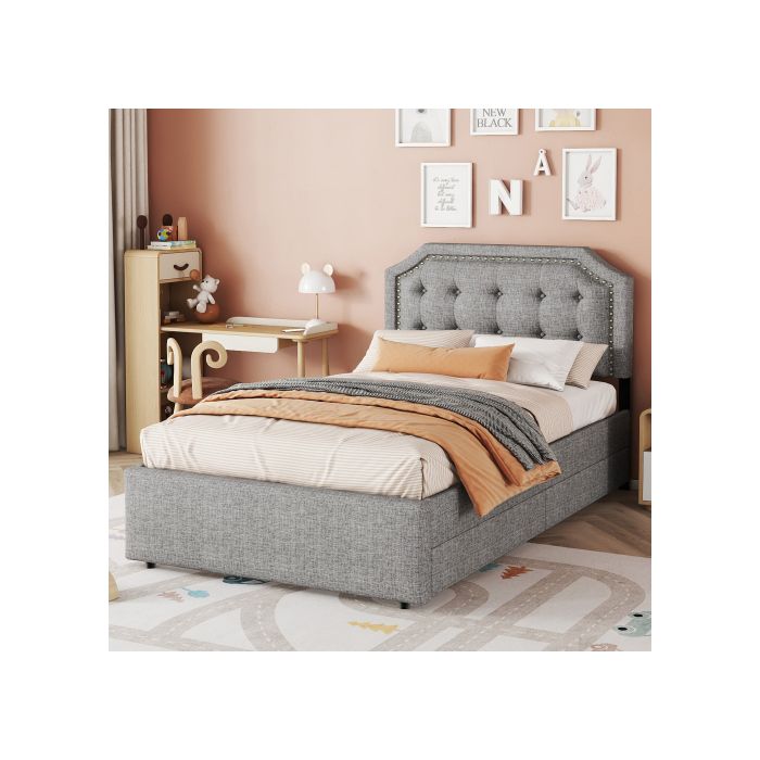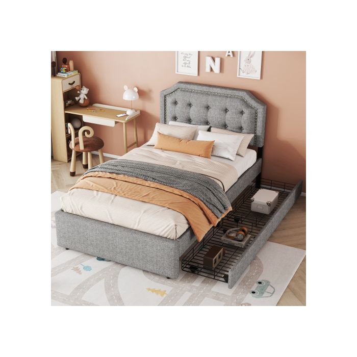 Lit plat 90*200 cm, lit rembourré, chevet rembourré avec rivets décoratifs, double tiroirs, gris