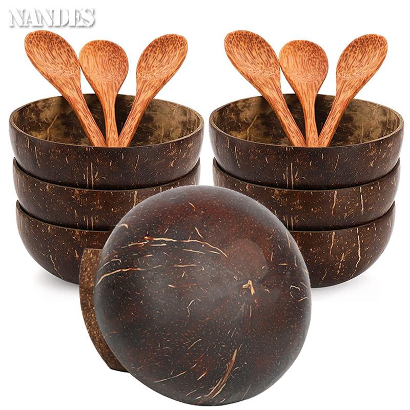 Набор натуральных кокосовых мисок Ручная работа Деревянная посуда Деревянная ложка Десерт Фруктовый салат Смешивание Рамен Миска для хранения Кухонная посуда