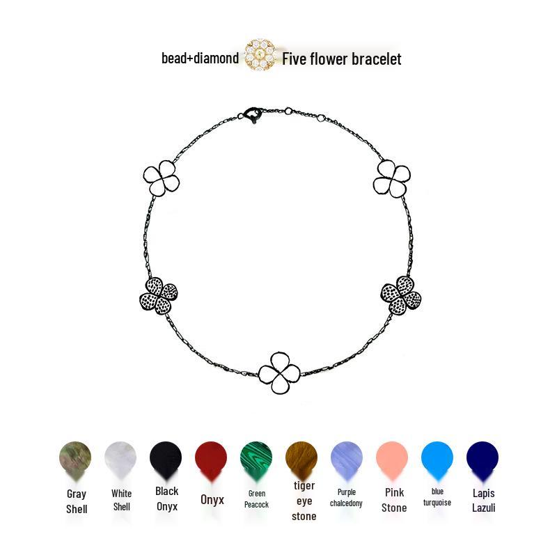 Браслет «Пятицветный золотой клевер на удачу»: Медь с инкрустациями бриллиантами из черного, белого, красного и зеленого агата.
