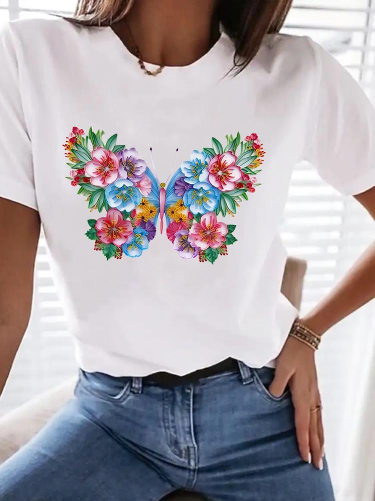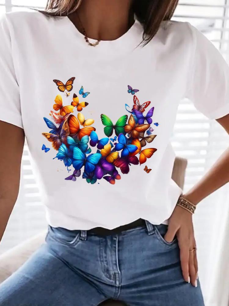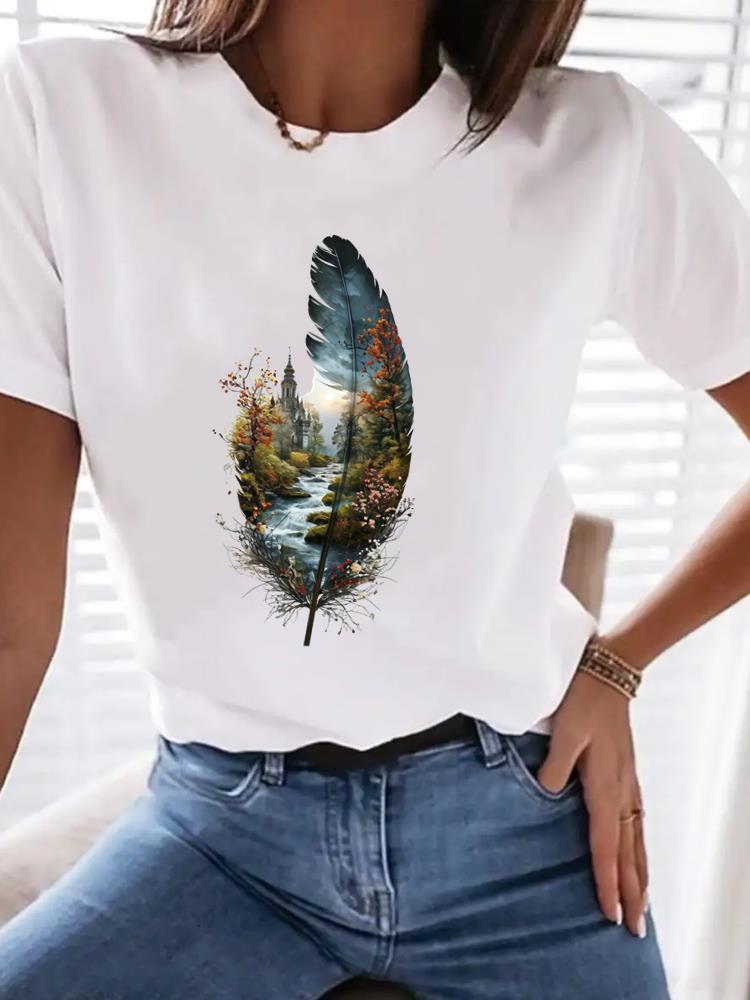 (Азиатский размер) Одежда Футболка Майка Топ Женская Мода Женщина Принт стиль перьев милая 90-е Короткий рукав Графические футболки