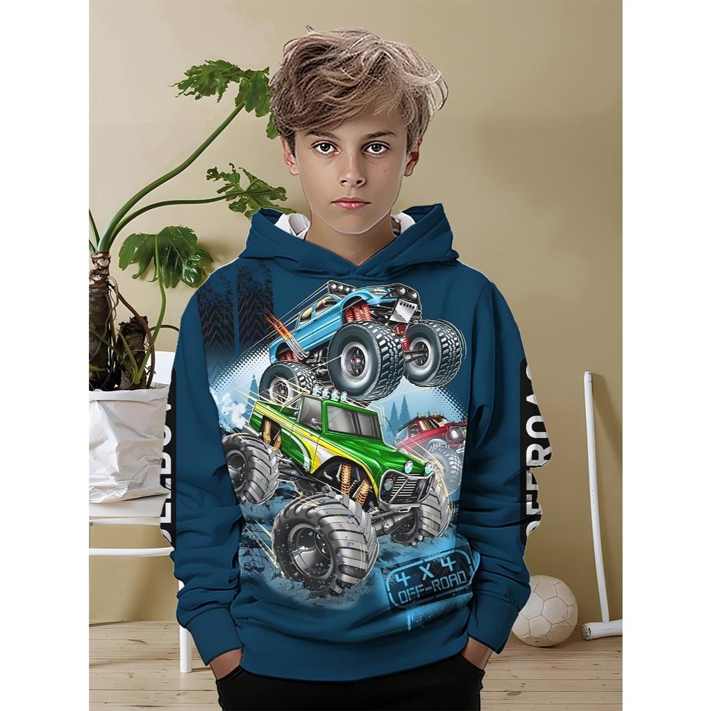 Big wheel truck 4x4 printed boys' simple hoodie - casual round neck long sleeved pullover, fashionable all season hoodie