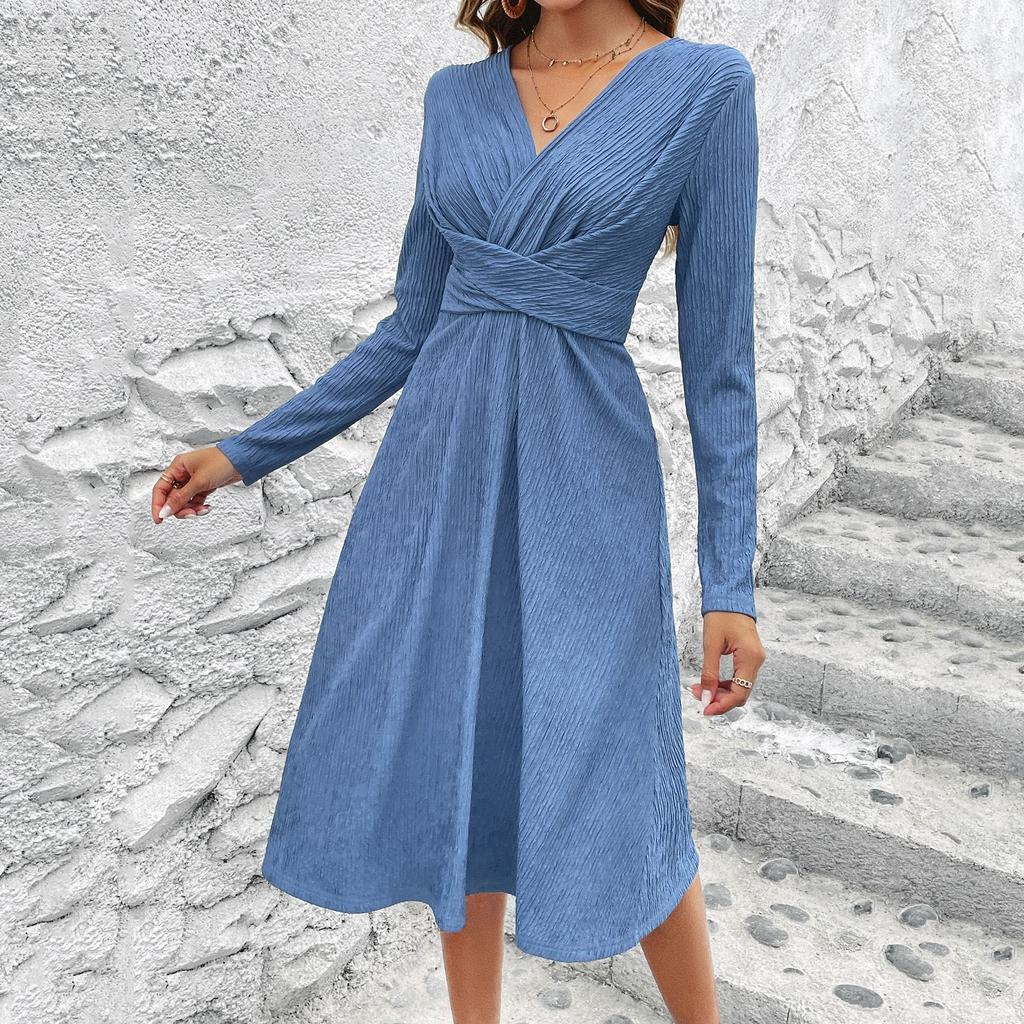 Женское однотонное платье длиной до колена с длинными рукавами и V-образным вырезом