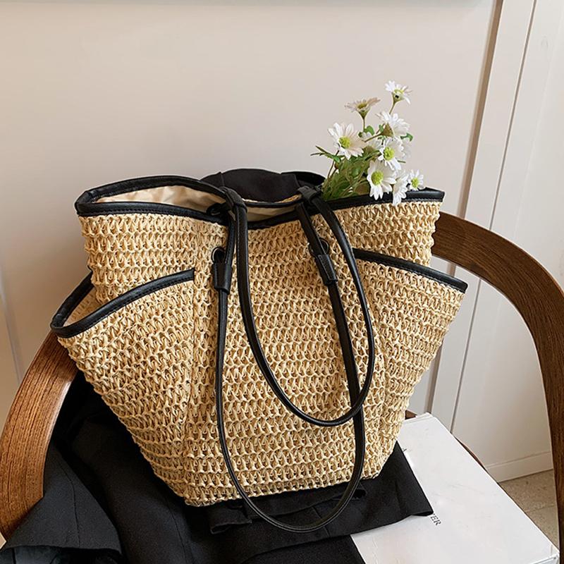 Летняя пляжная соломенная сумка через плечо с множеством карманов для женщин, сетчатая, прочная, дорожная сумка-тоут, большая вместимость, плетёная сумка-ведро CLE