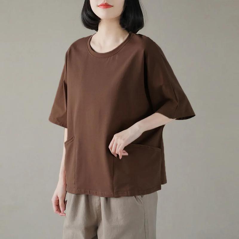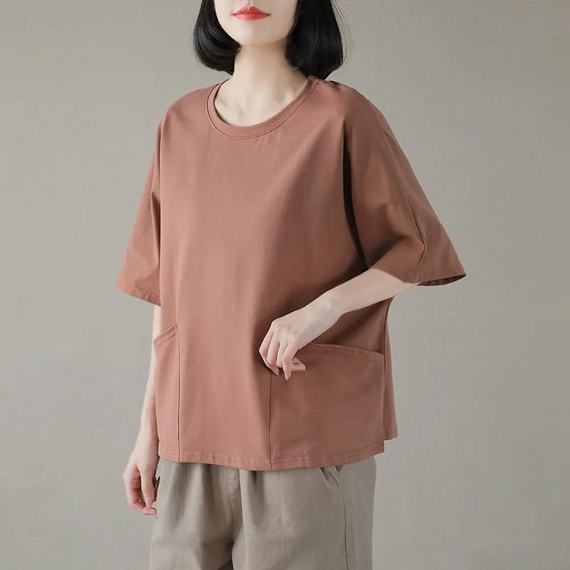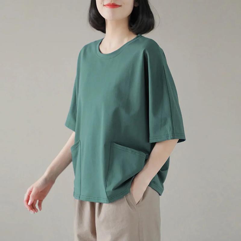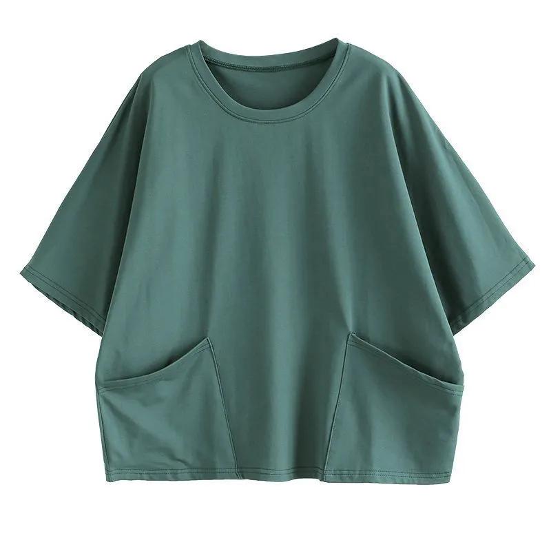 Хлопковая футболка большого размера, топы с короткими рукавами, женские весенне-летние удобные повседневные нижние рубашки, однотонные женские топы с карманами