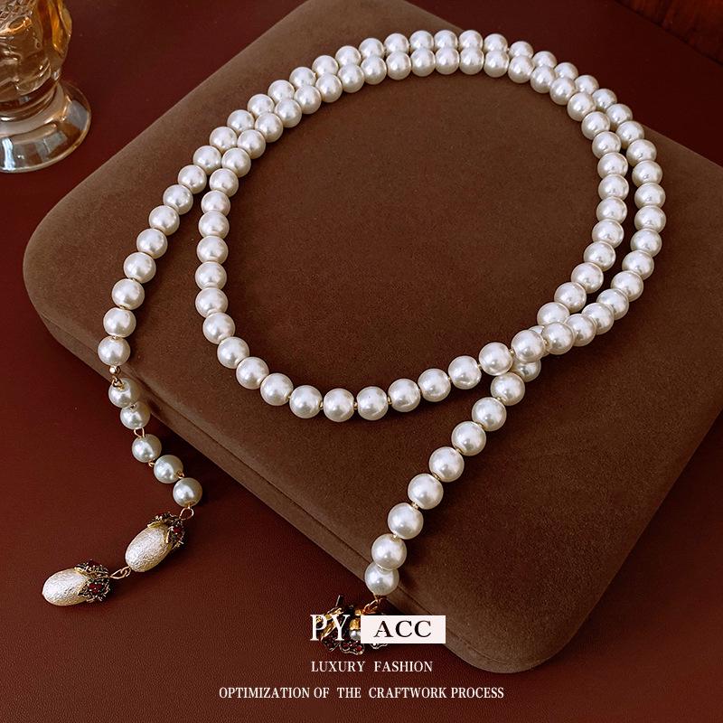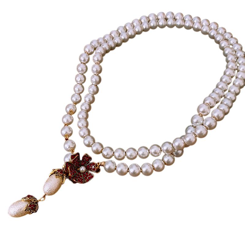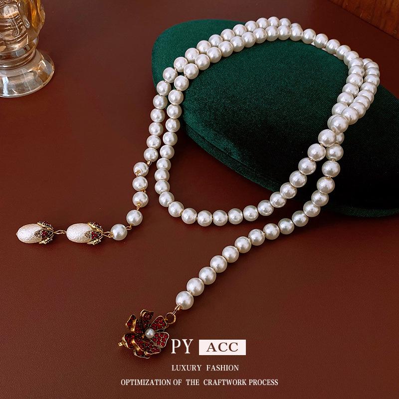 Ожерелье с цветами из страз и стеклянным жемчугом - Французская ретро-мода, Цепочка для свитера, Универсальное и элегантное украшение.