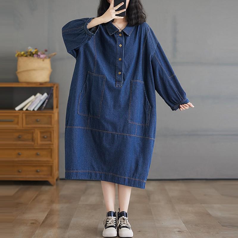 Женское повседневное длинное платье с отложным воротником, однотонное, свободного кроя, женские джинсовые платья