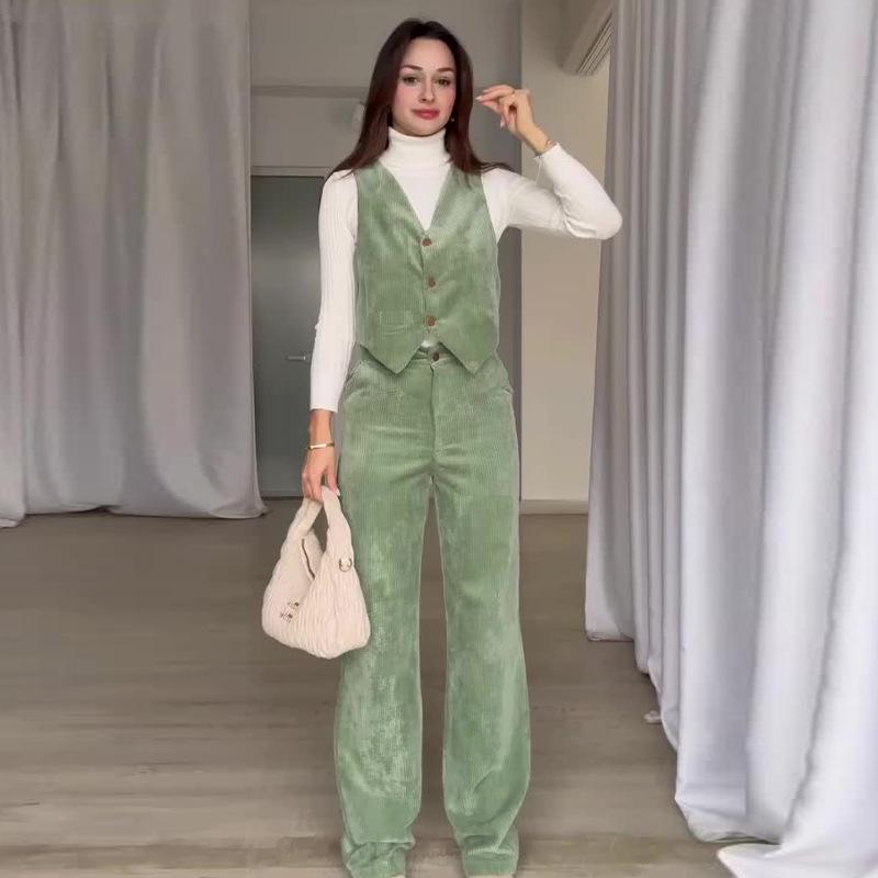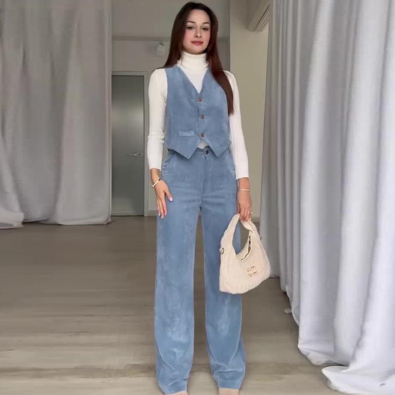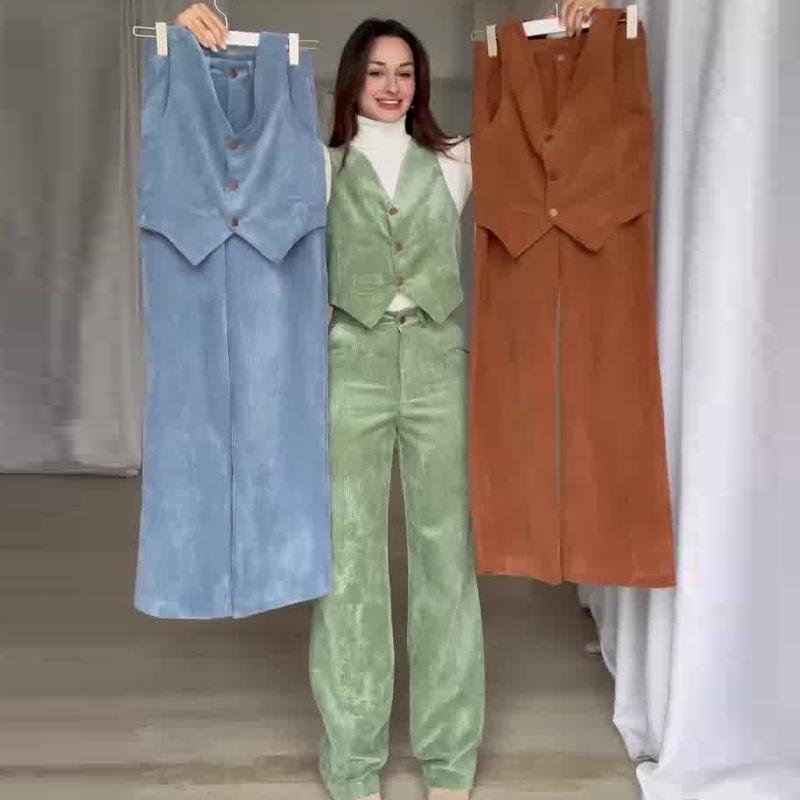 Женский вельветовый однотонный жилет с V-образным вырезом и брюки прямого кроя, комплект, осень 2024