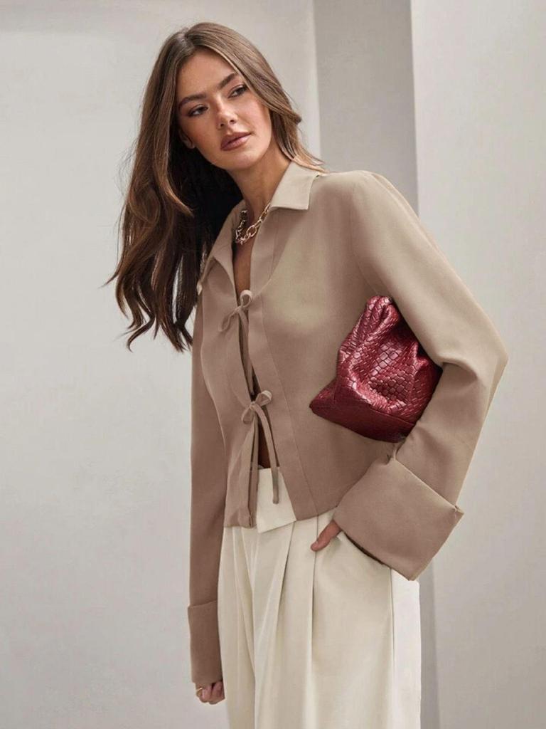 Побалуйте себя непринужденной элегантностью с этим кардиганом-рубашкой с длинным рукавом на весну/лето, созданным для стильных женщин.. Изготовленная из высококачественного полиэстера, эта рубашка обеспечивает удобную и дышащую посадку.. Однотонный узор добавляет нотку изысканности, а свободный крой обеспечивает расслабленную и универсальную посадку.. Благодаря уникальному воротнику-стойке и очаровательному украшению в виде банта, это изделие органично сочетает в себе классический стиль и современный шик, что делает его идеальным дополнением к вашему сезонному гардеробу.
