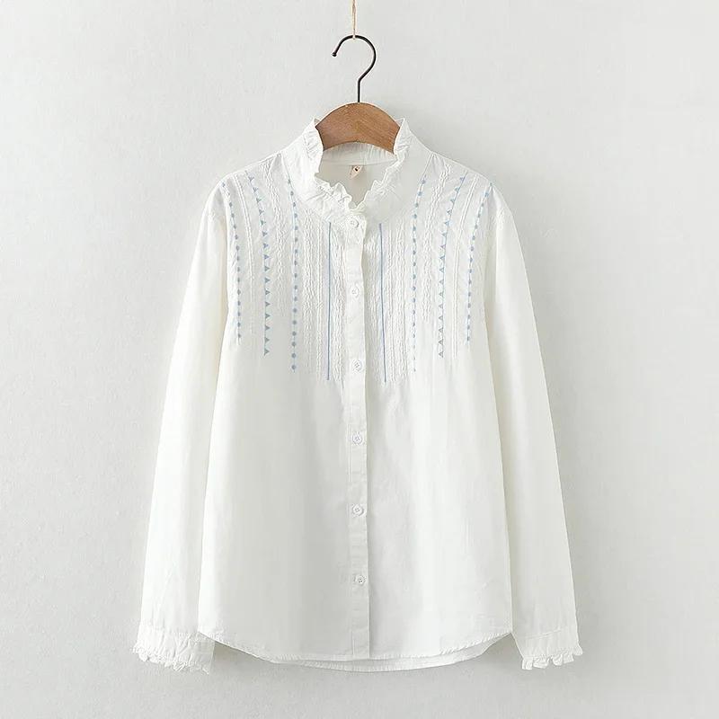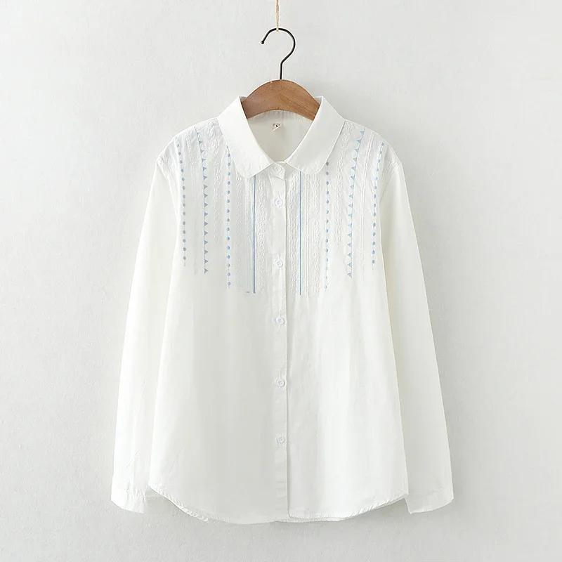 Жаккардовые хлопковые рубашки с длинными рукавами с вышивкой, женские осенние новые кружевные белые блузки, женские свободные повседневные блузки и топы