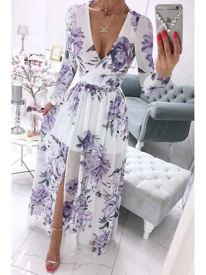 Богемное шифоновое платье с V-образным вырезом, принтом и длинным рукавом для женщин 2024