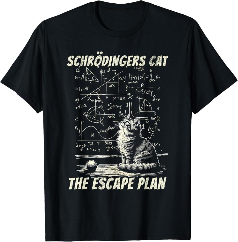 Черная футболка с научным юмором с иллюстрацией кота Шрёдингера и уравнениями
