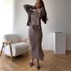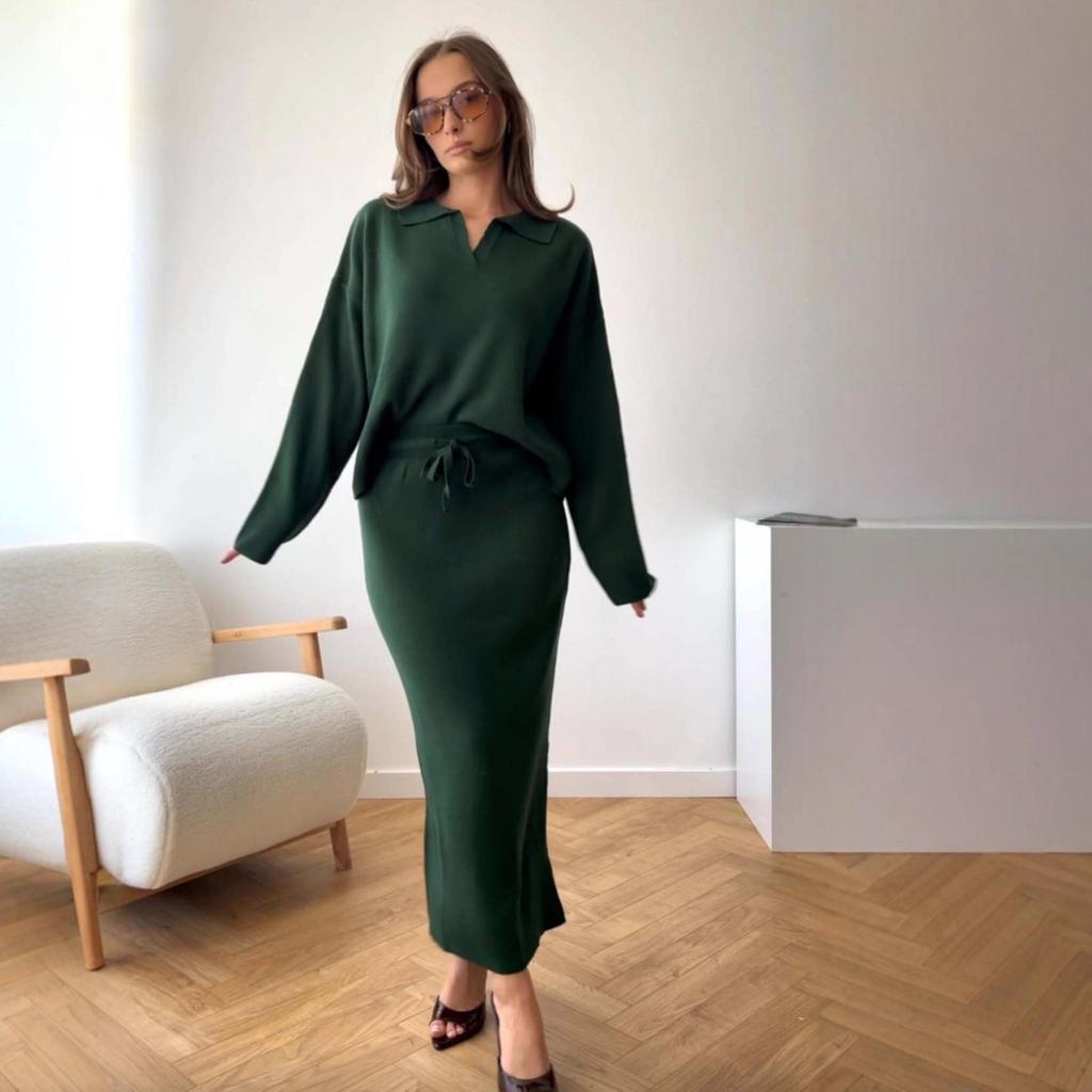 Осень 2025 Европейский и американский стиль Женский вязаный топ с воротником-рубашкой и юбка миди — купить товар онлайн с бесплатной доставкой по всему миру!