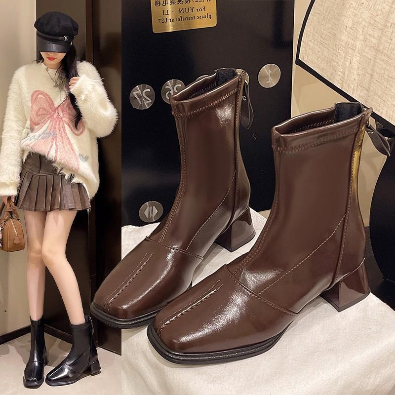 Корейская версия ботильоны на толстом каблуке с квадратным носком женские ботинки осень и зима ботинки Челси французские ретро коричневые кожаные ботинки тонкие ботинки