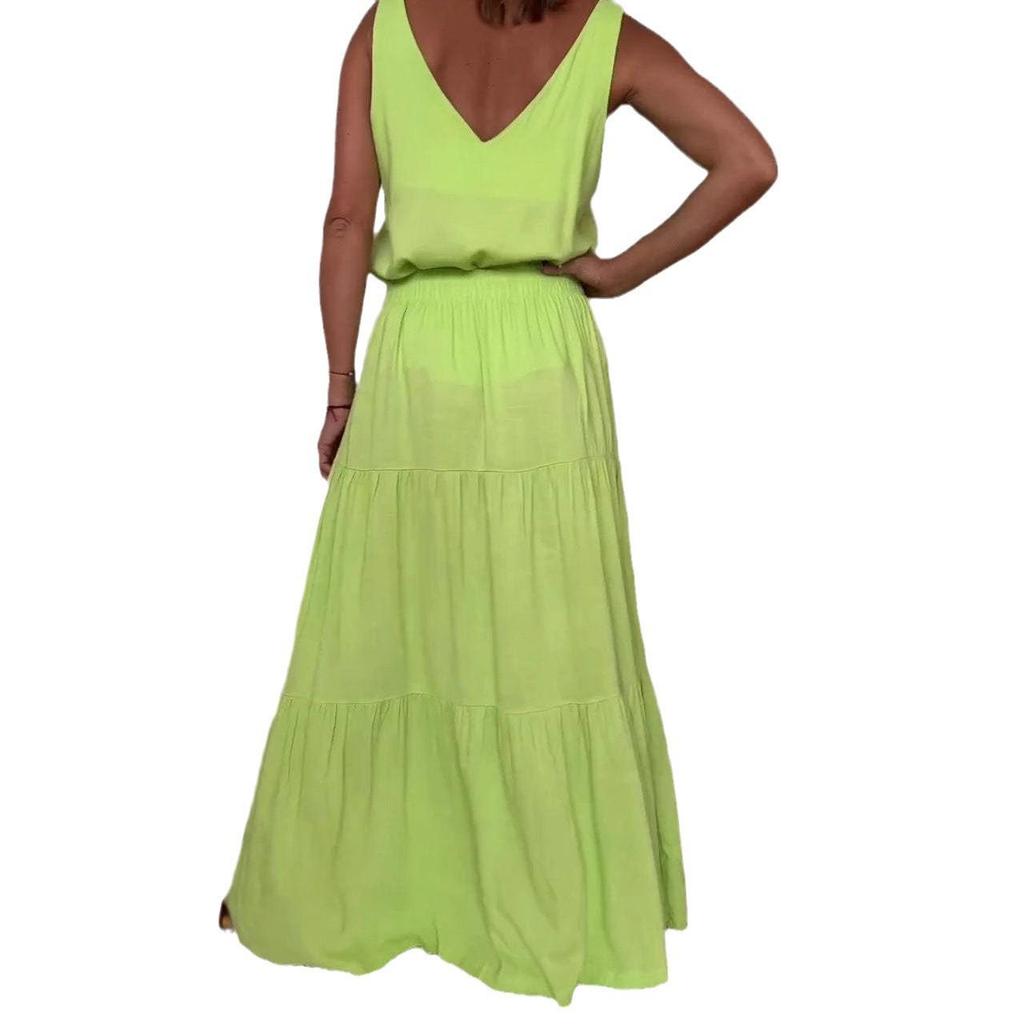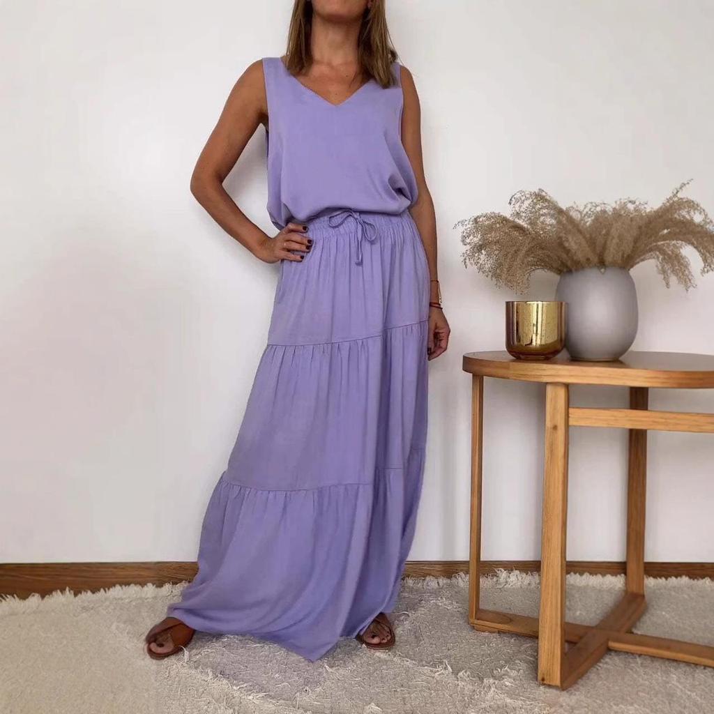 Обновите свой гардероб этим стильным женским комплектом с топом без рукавов с V-образным вырезом и юбкой, идеально подходящим для весенне-летнего сезона 2024 года.. Этот наряд, изготовленный из высококачественного полиэстера, сочетает в себе комфорт и гладкий спортивный стиль.. Однотонный дизайн предлагает вневременной и универсальный вид, что делает его идеальным для различных случаев, от повседневных прогулок до активных занятий.. Встречайте сезон в этом шикарном и непринужденно модном комплекте.