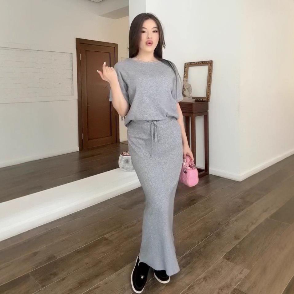 Летний женский вязаный топ с коротким рукавом и круглым вырезом в европейском и американском стиле с юбкой миди