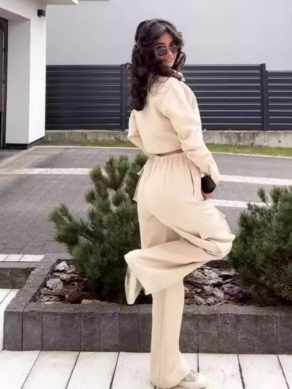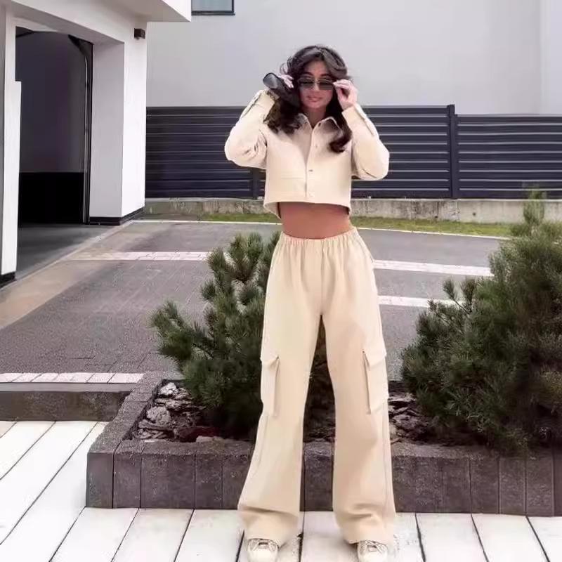 2024 Осень Европейский и американский однотонный кроп-топ с лацканами и комплект брюк с высокой талией и широкими штанинами для женщин