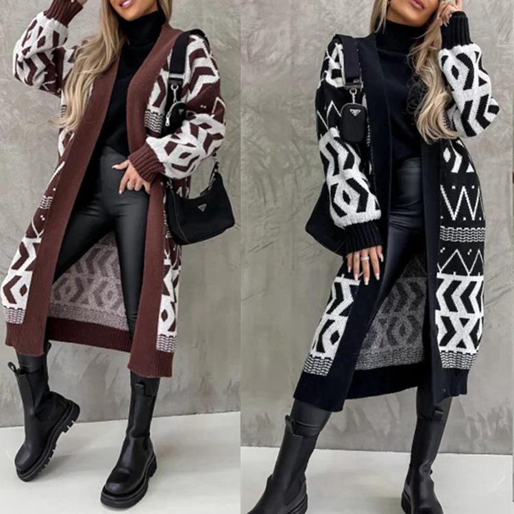 Женский жаккардовый трикотажный кардиган с V-образным вырезом, свободного кроя, с геометрическим узором - Осень/Зима