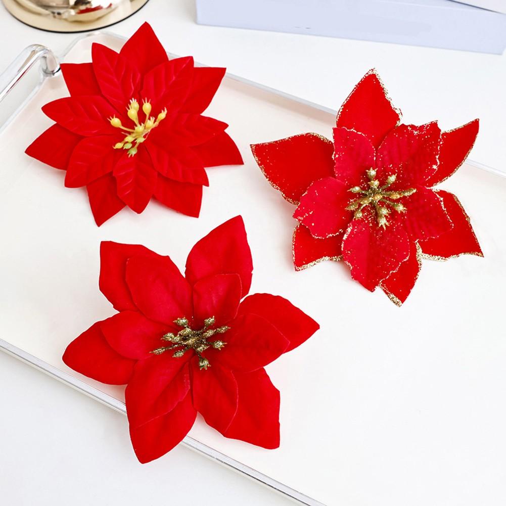 *Потрясающее глиттерное покрытие: Эти искусственные цветы пуансеттии украшены мерцающими блестками, которые усиливают их визуальную привлекательность, делая их пленительным дополнением к вашему праздничному декору..