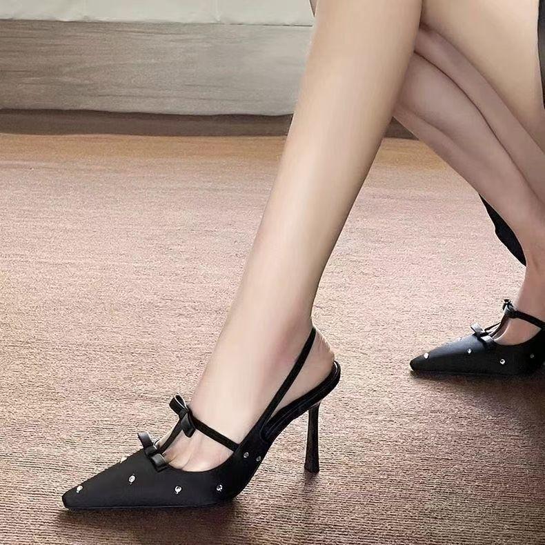 Black bow sexy beautiful high heels women's 2025 spring new temperament socialite thin heel pointed single shoes rhinestone