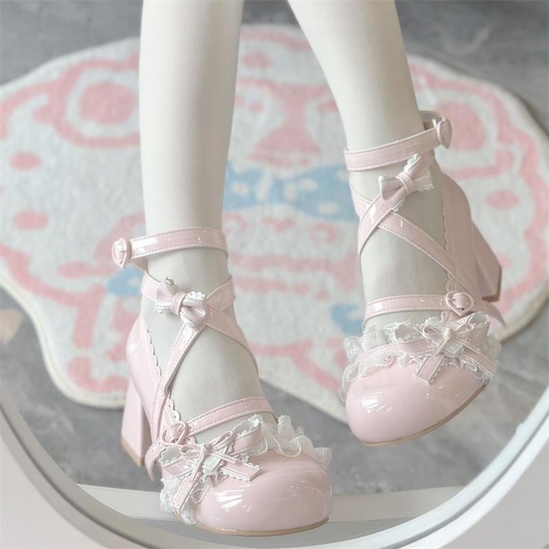 Милые маленькие белые туфельки лолита кружево маленькие кожаные туфли круглый носок кружево кукла милая девушка средний каблук мэри джейн высокий каблук