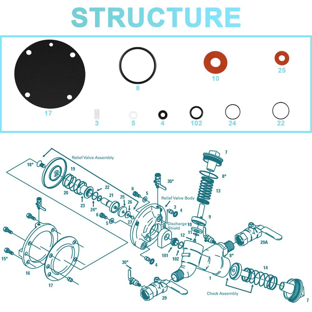 905111 Полный ремкомплект из резины Подходит для Febco Обратный клапан 825Y Серия 3/4"-1-1/4" Узел зоны пониженного давления