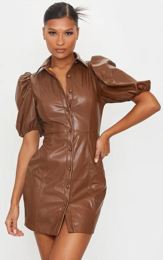 Коричневый Стильный Натуральный Настоящий Повседневный Кожаный Ягненок Мягкое Платье Женское