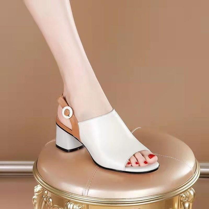 Женские сандалии с цветными блоками и пустой пряжкой, с универсальными европейскими и американскими сандалиями на широком каблуке для улицы в 2025 году