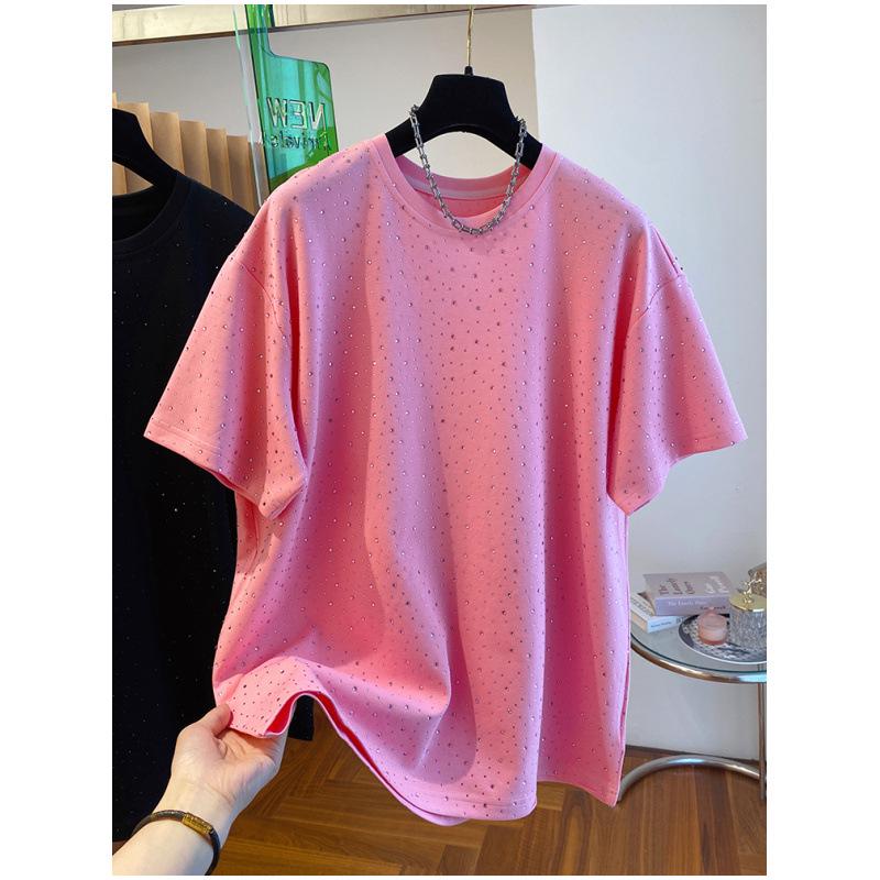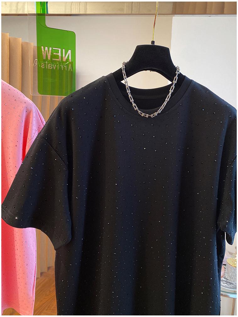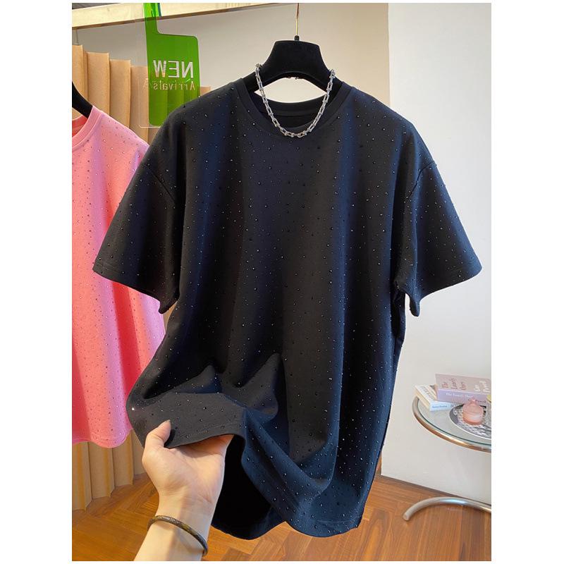 Черная хлопковая футболка с коротким рукавом для пухленькой девушки с блестящим дизайном в виде бриллиантов