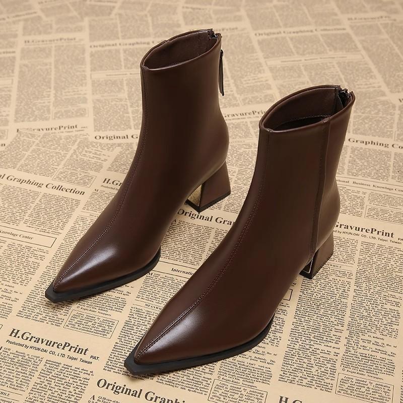 Премиальные короткие ботинки женские толстый каблук маленькие ароматные остроносые ботинки Мартина высокие каблуки маленькие ботильоны корейские черные тонкие ботинки