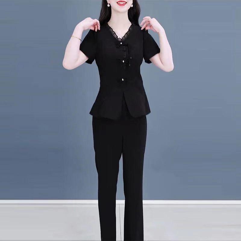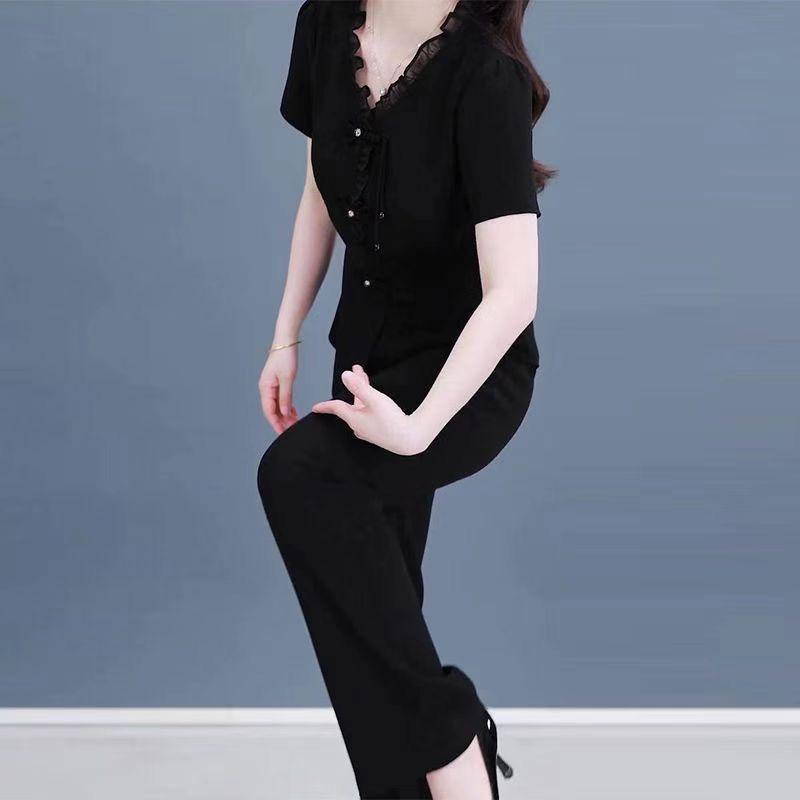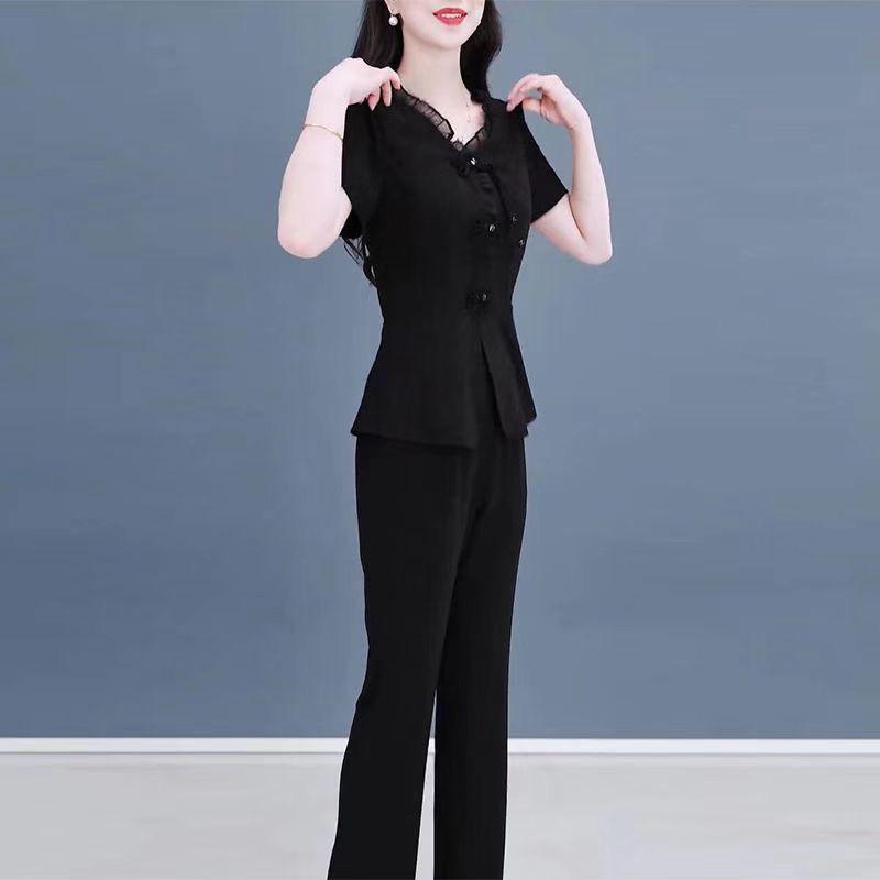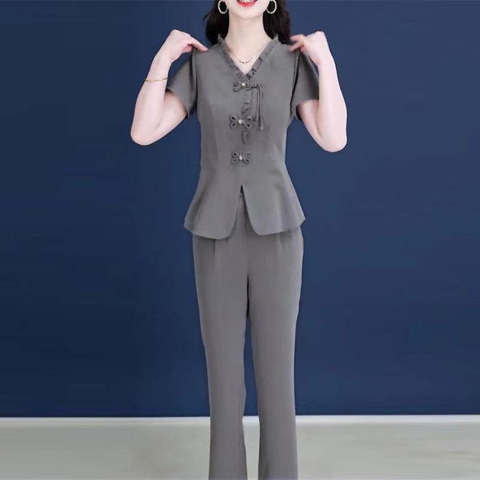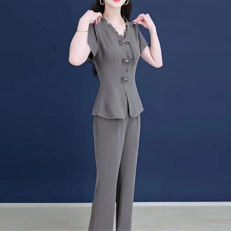 Женский элегантный летний комплект из двух предметов: блузка с короткими рукавами и оборками и повседневные длинные брюки.