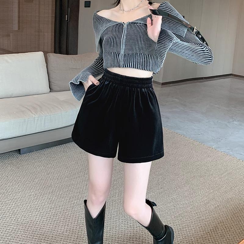 Женские черные бархатные шорты А-силуэта с эластичной талией, ранняя осень 2024, свободный крой, утолщенная ткань.