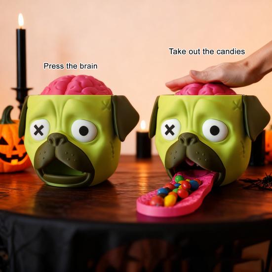 Уникальный декор на Хэллоуин: Сочетая жуткую зомби-эстетику с милотой мопса, этот диспенсер для конфет служит и как увлекательный настольный аксессуар, и как привлекательное украшение для Хэллоуинского стола, создающее настроение.