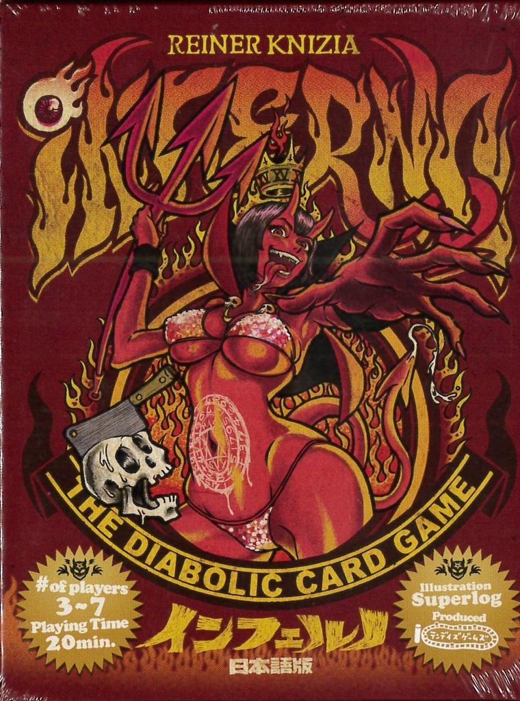 Title: Inferno (Japanese Version) Designer: Reiner Knizia Illustrations: Superlog Publisher: Ten Days Games Release Year: 2016 (Original: 2005) Players: 3-7 Playing Time: 20 minutes Recommended Ages: 8+ Knizia's easy-to-play yet intense card game has been revived in Japanese! What's more, the illustrations are by Superlog, the popular illustrator behind the game "Banquilpon"! This title is incredibly unique! On a player's turn, they must play a card that matches the "first card" played by the starting player in either number or color (or both). If they can't play a card (or don't want to play a card), they must take all cards that have been played up to that point. The cards they take away result in a loss of points. This may seem like a very simple game, but what makes it so interesting is the red card that gives the game its title, the "Inferno Card." Normally, you lose points for each card you pick up, but with red cards, the number on the card will be the same as the number on the card.